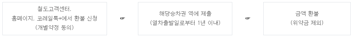 - 전화·인터넷·코레일톡+ 환불 신청 서비스는 특별약정 제도로 운영하고 있으며 고객이 환불 청구, 환불 안내 등에 동의한 경우에 한하여 이용이 가능합니다.